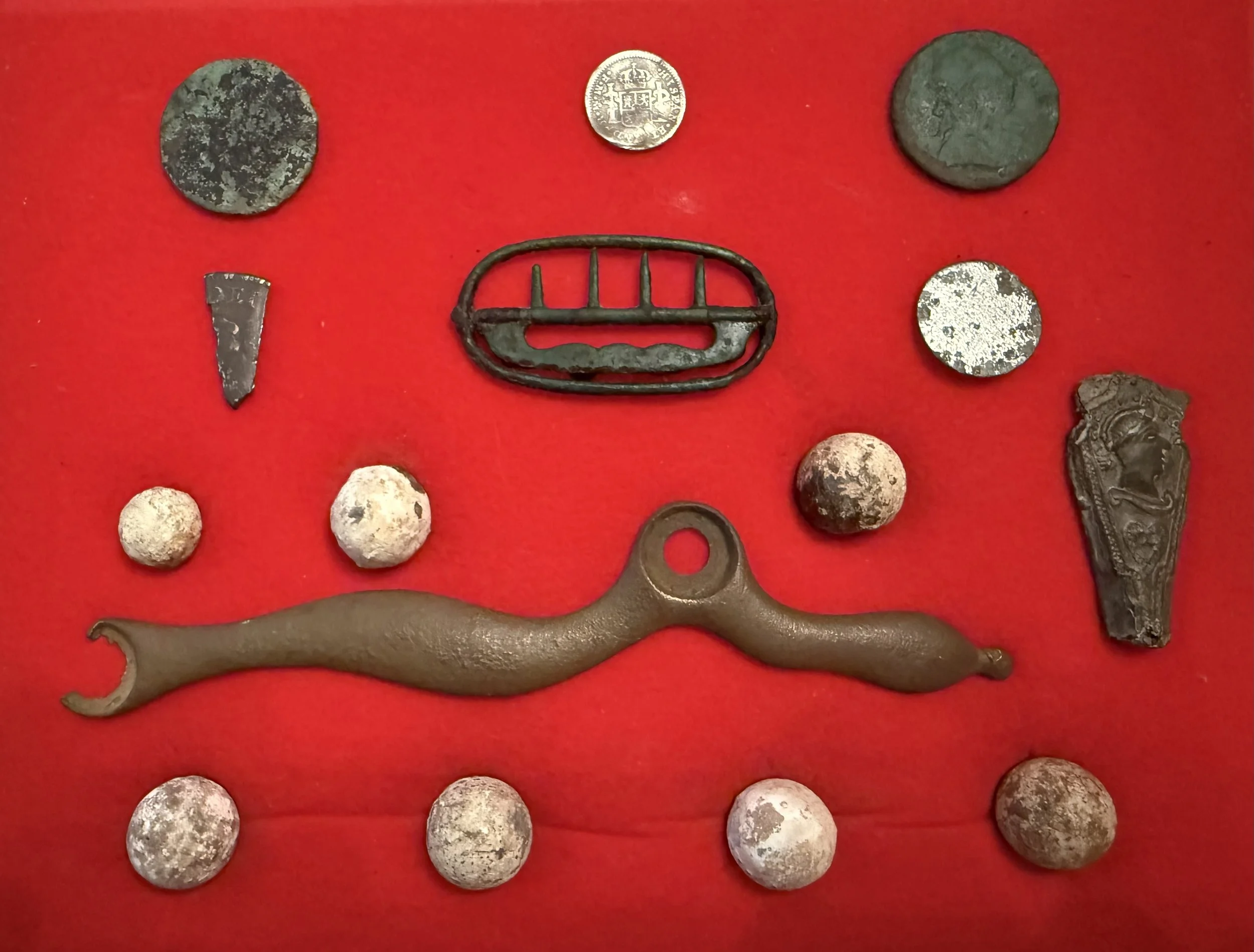British revolutionary war campsite relics, including coins, spoon handle with King George III bust, Brown Bess side plate, musket balls and a neck stock buckle that still works!